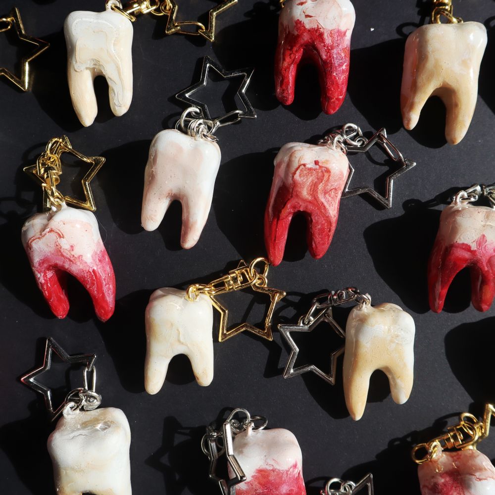 Hand made clay teeth sealed in resin for that shiny tooth finish :)